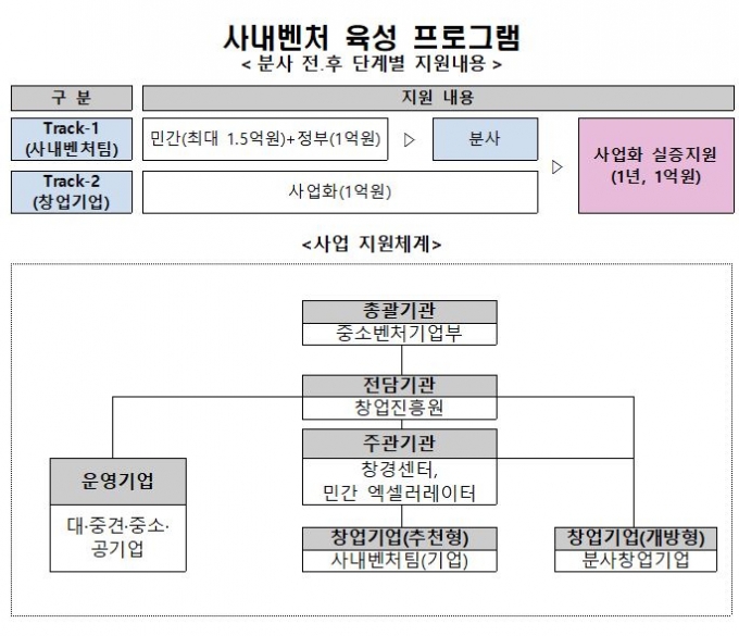 사내벤처 육성 프로그램은 대기업과 중견기업 등의 재직경력을 기반으로 사내벤처팀(분사기업)의 사업화를 지원하는 사업이다. 올해 사업예산은 총 200억원이다. 운영기업 자격은 △사내벤처 운영 규정 △지원부서(인력) △상생협력 프로그램 운영 등 사내벤처 지원에 필요한 전반적 요건을 갖추고 있는 대·중견·중소·공기업이다. 운영기업은 사내벤처 육성 프로그램의 지원 대상이 되는 사내벤처팀 또는 창업한지 3년 이내의 분사창업기업을 자체 발굴, 추천하는 역할을 담당한다.
